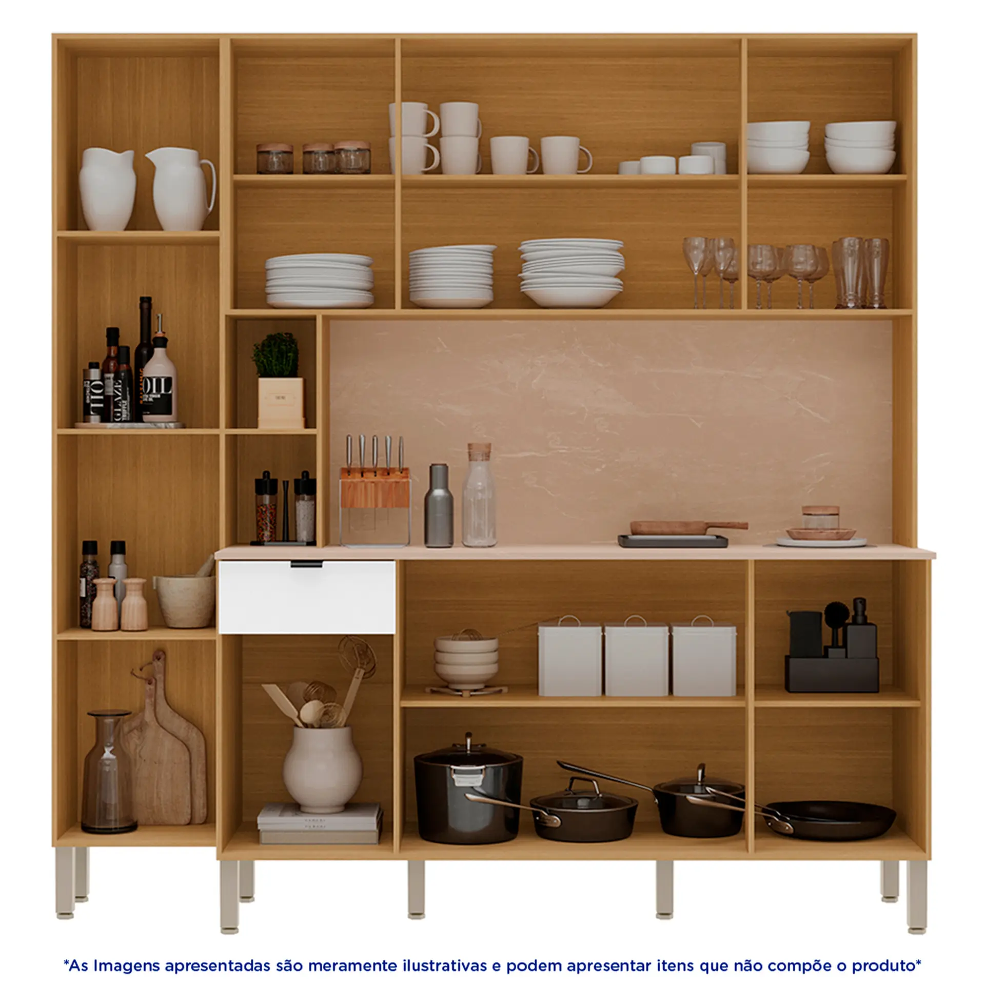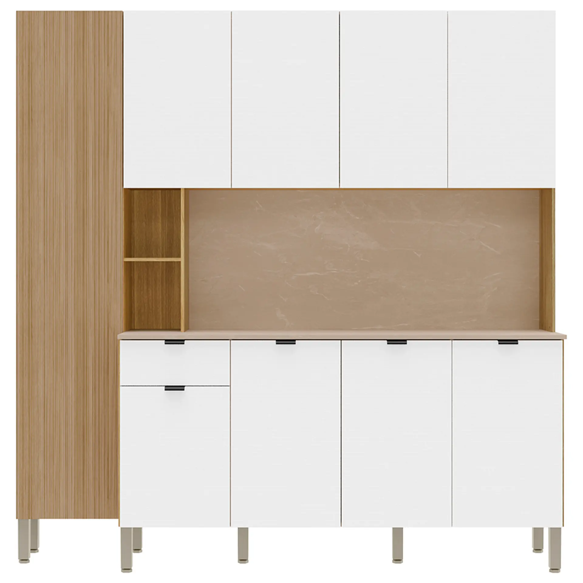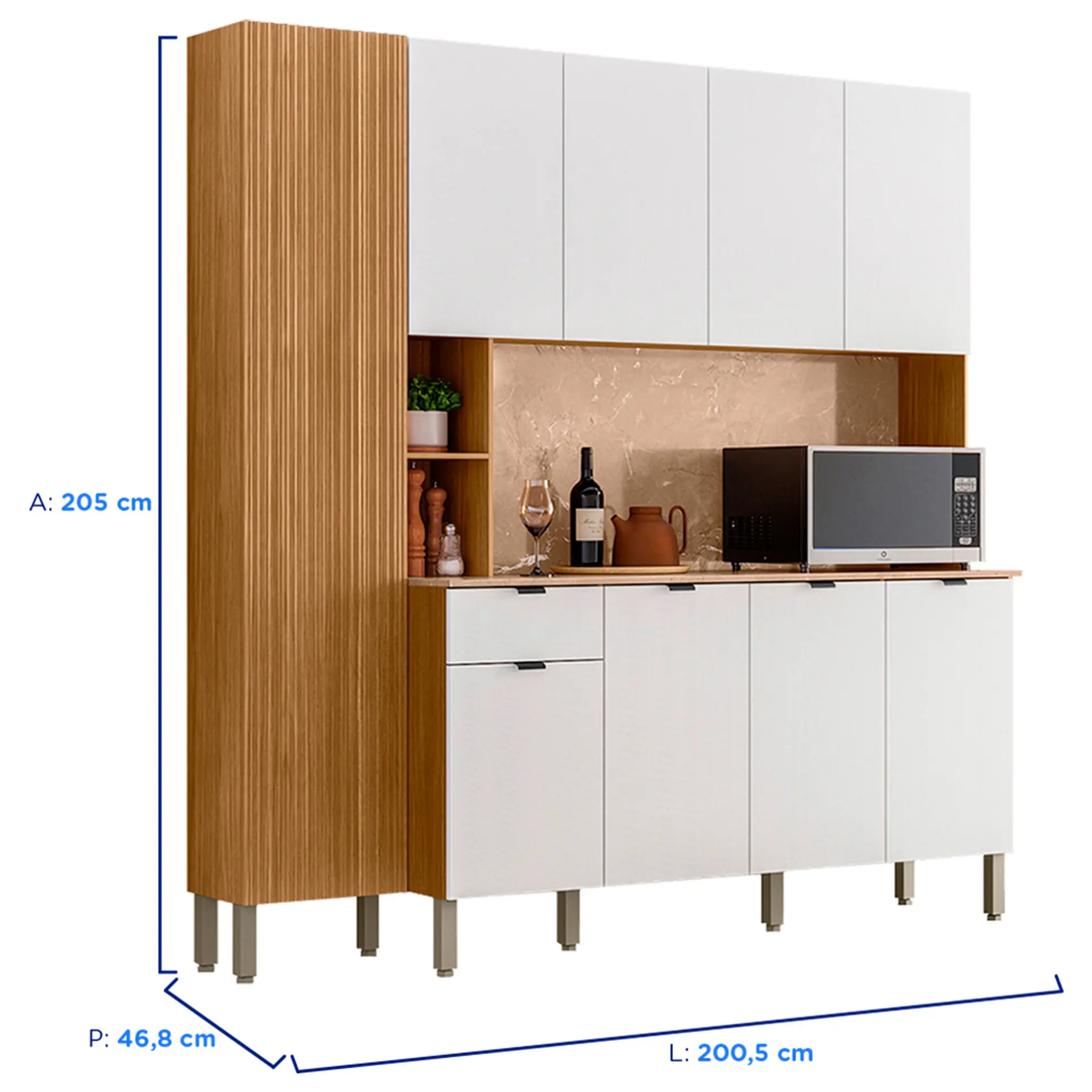 Produzida em MDP, a cozinha conta com 9 portas e 1 gaveta equipada com rediças telescópicas, proporcionando um movimento suave e durável. Os 2 nichos são para armazenar itens de fácil acesso, enquanto o sistema de amortecimento nas portas garante maior conforto e segurança no fechamento. As portas superiores possuem fecho touch, uma solução prática e inovadora que dispensa puxadores, mantendo um visual clean e sofisticado. Além disso, a Cozinha Compacta Pulse vem com pés reguláveis, que ajudam a proporcionar maior estabilidade e facilitam a adaptação do móvel a diferentes tipos de piso. Com essa cozinha, você pode guardar utensílios de pequeno e grande porte sem preocupações, mantendo tudo organizado e ao alcance das mãos.