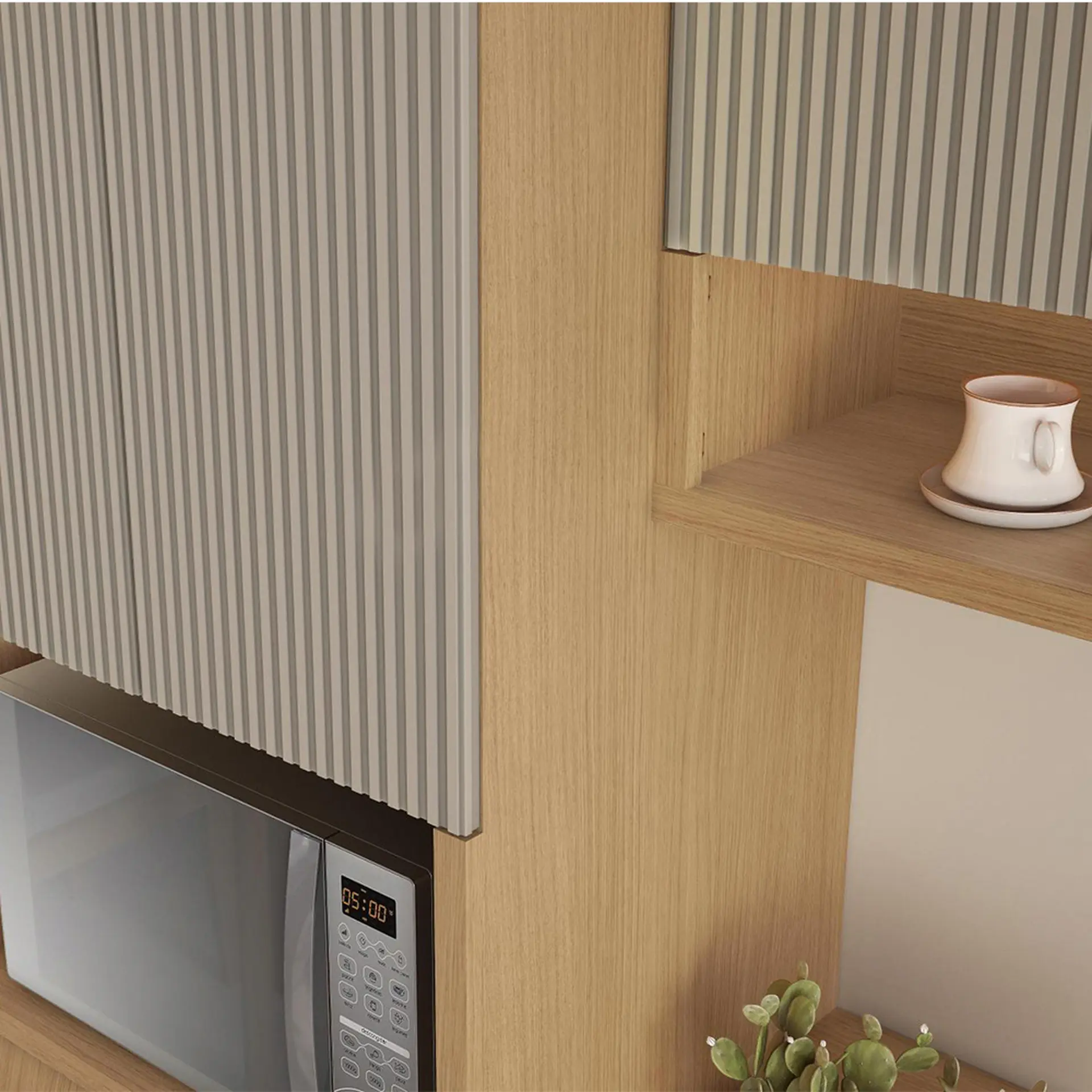 A última peça do conjunto, o Armário Aéreo Nesher 80cm 02 portas, também possui design canelado, com portas que trazem um toque sofisticado e moderno. As dobradiças Slow Motion, com freio anti-impacto, proporcionam fechamento suave. O armário conta com prateleiras internas que facilitam a organização.