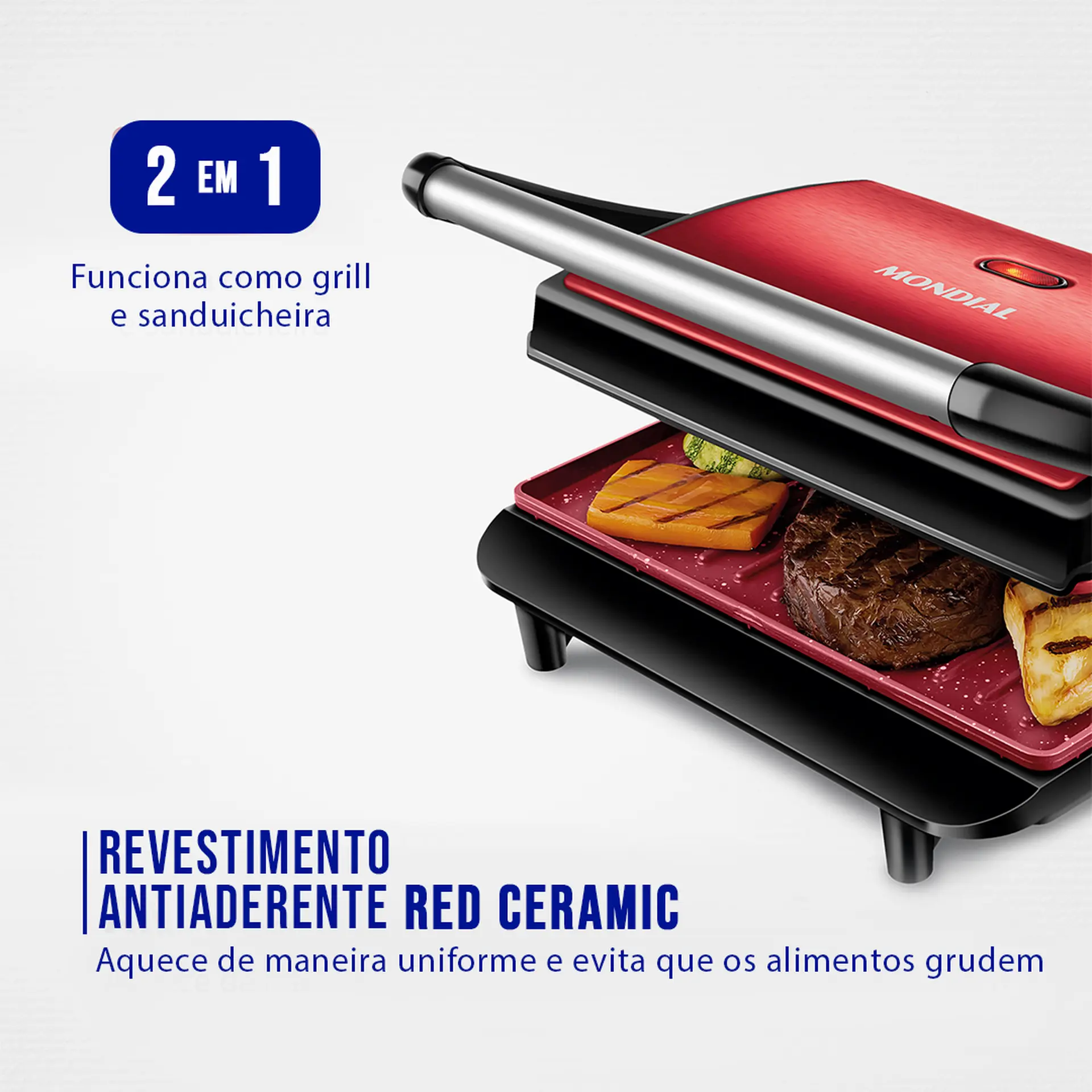 Grill Sanduicheira Mondial Ceramic PG01RC Antiaderente 1000W – Vermelho/Preto – 220 Volts