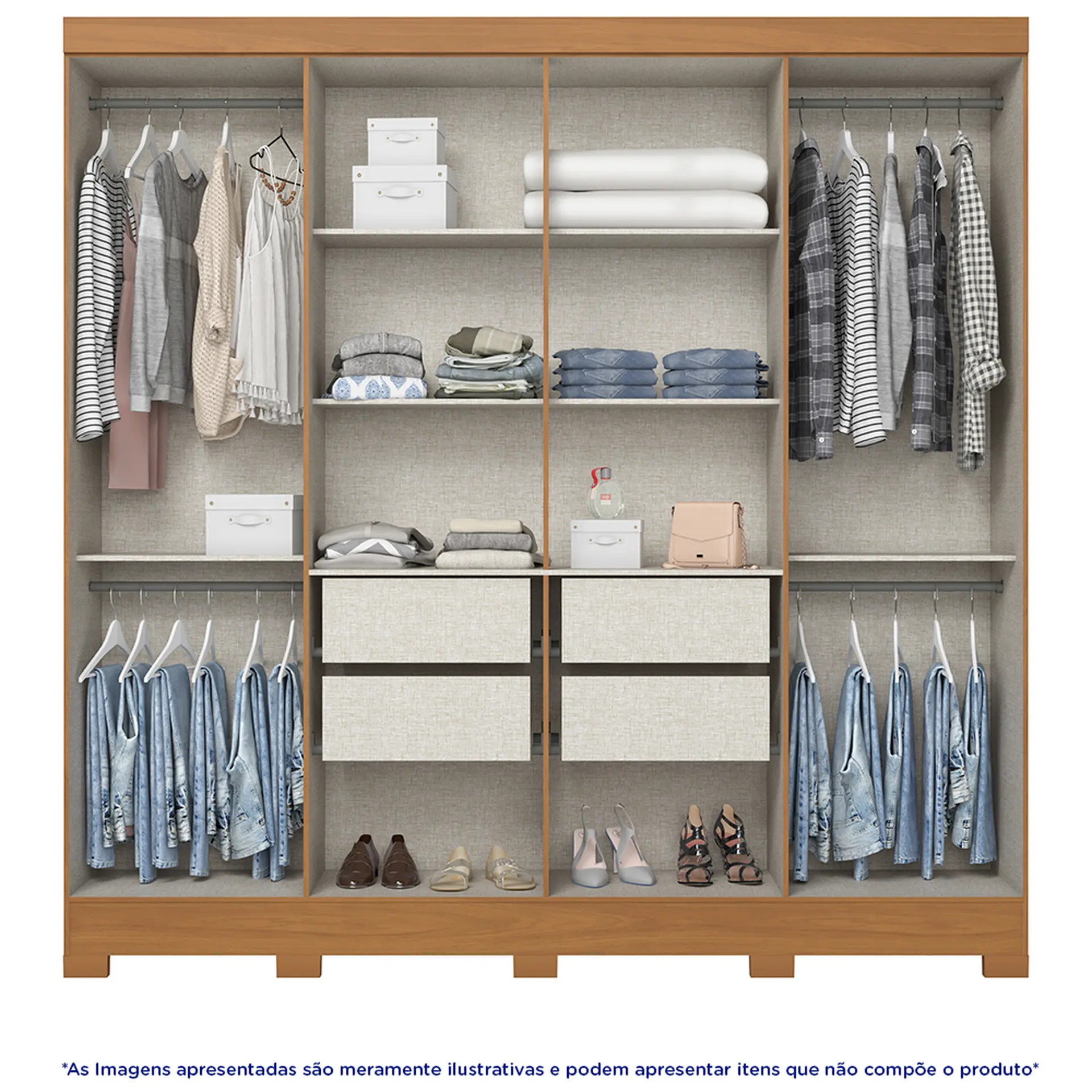 , sendo 2 na parte de cima e 2 na parte de baixo, que podem servir como calceiro. Tudo para levar a melhor qualidade de roupeiro para sua casa.