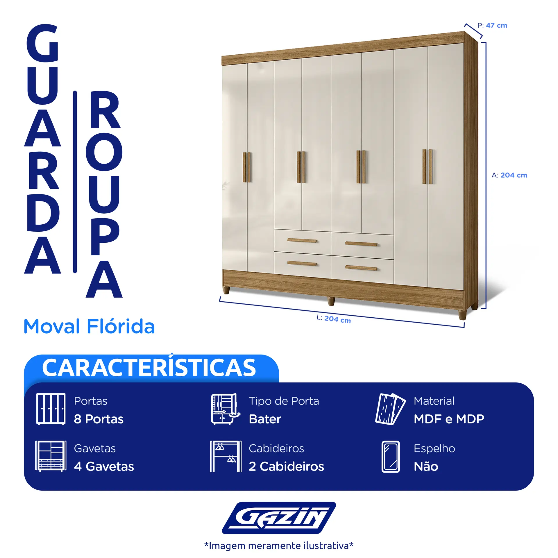 GUARDA-ROUPA CASAL 8 PORTAS 4 GAVETAS FLÓRIDA MOVAL ROUPEIRO