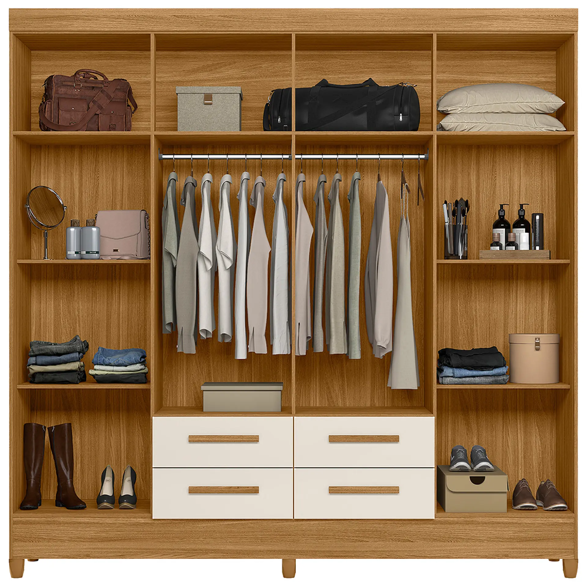 à disposição para você colocar objetos, artigos de beleza, roupas dobradas nas prateleiras ou esticadas nos cabides para não amassar, enfim, opções de espaço não vão faltar!