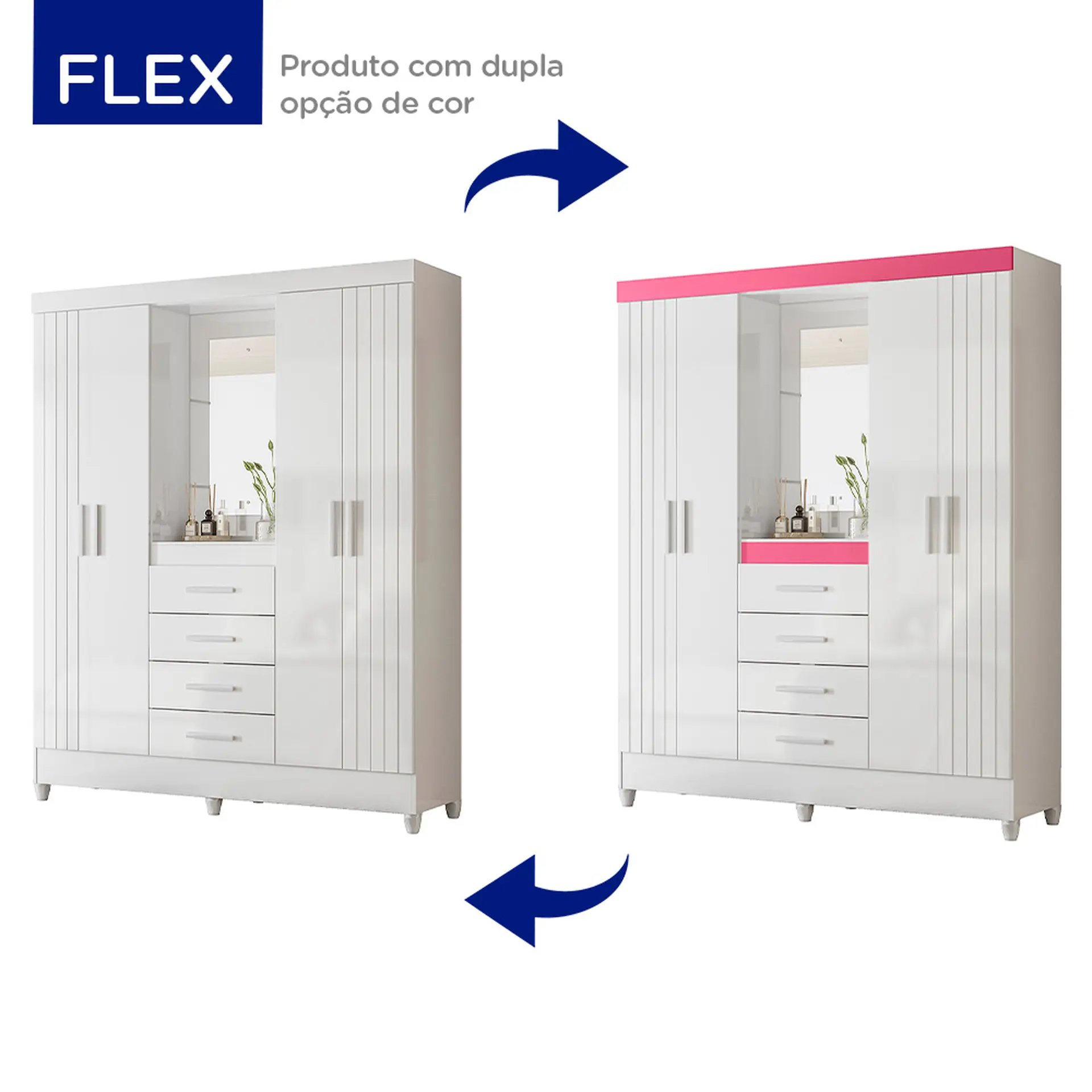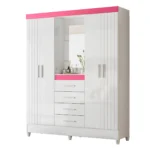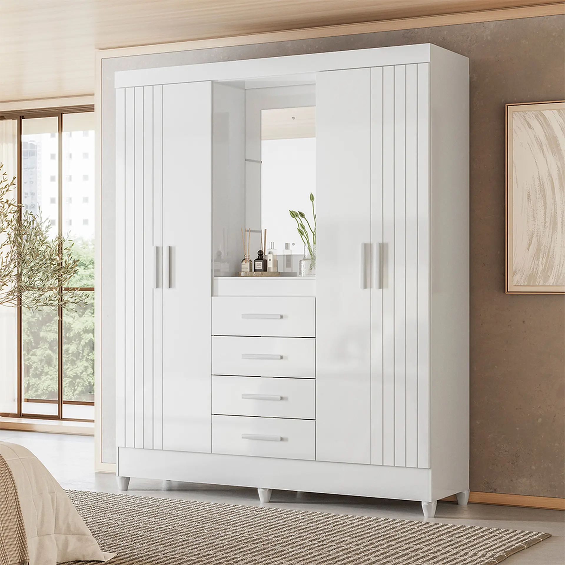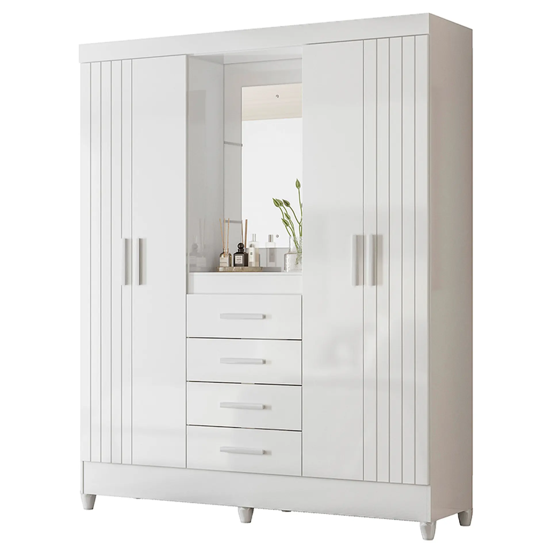 São 4 portas, sendo 2 com frisos deativos, que trazem sofisticação imediata ao quarto. No centro, a charmosa capelinha com espelho e prateleira funciona como destaque do móvel — ideal para perfumes, acessórios e itens especiais. Um detalhe que faz toda a diferença no visual.