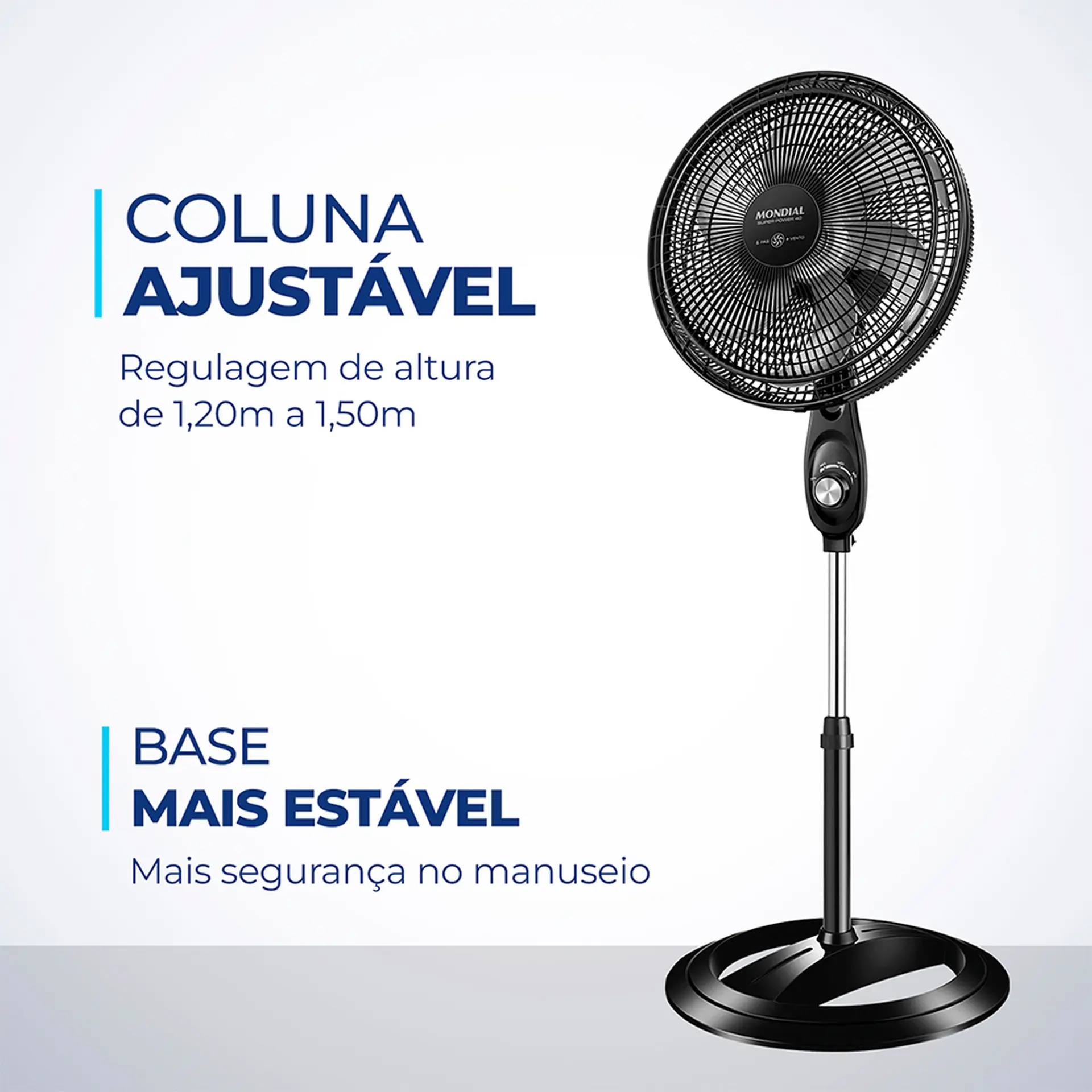 O ventilador de coluna Super Power VSP-40C-NB possui 40 cm de diâmetro e hélice com 6 pás, garantindo um ambiente mais refrescante e agradável. Com coluna ajustável entre 1,19 e 1,50 metros, o aparelho permite ajuste da altura do vento. O sistema de ventilação da Mondial apresenta baixo nível de ruído, assegurando o silêncio necessário para uma excelente noite de sono. Saiba mais sobre o VSP-40C-NB da Mondial: