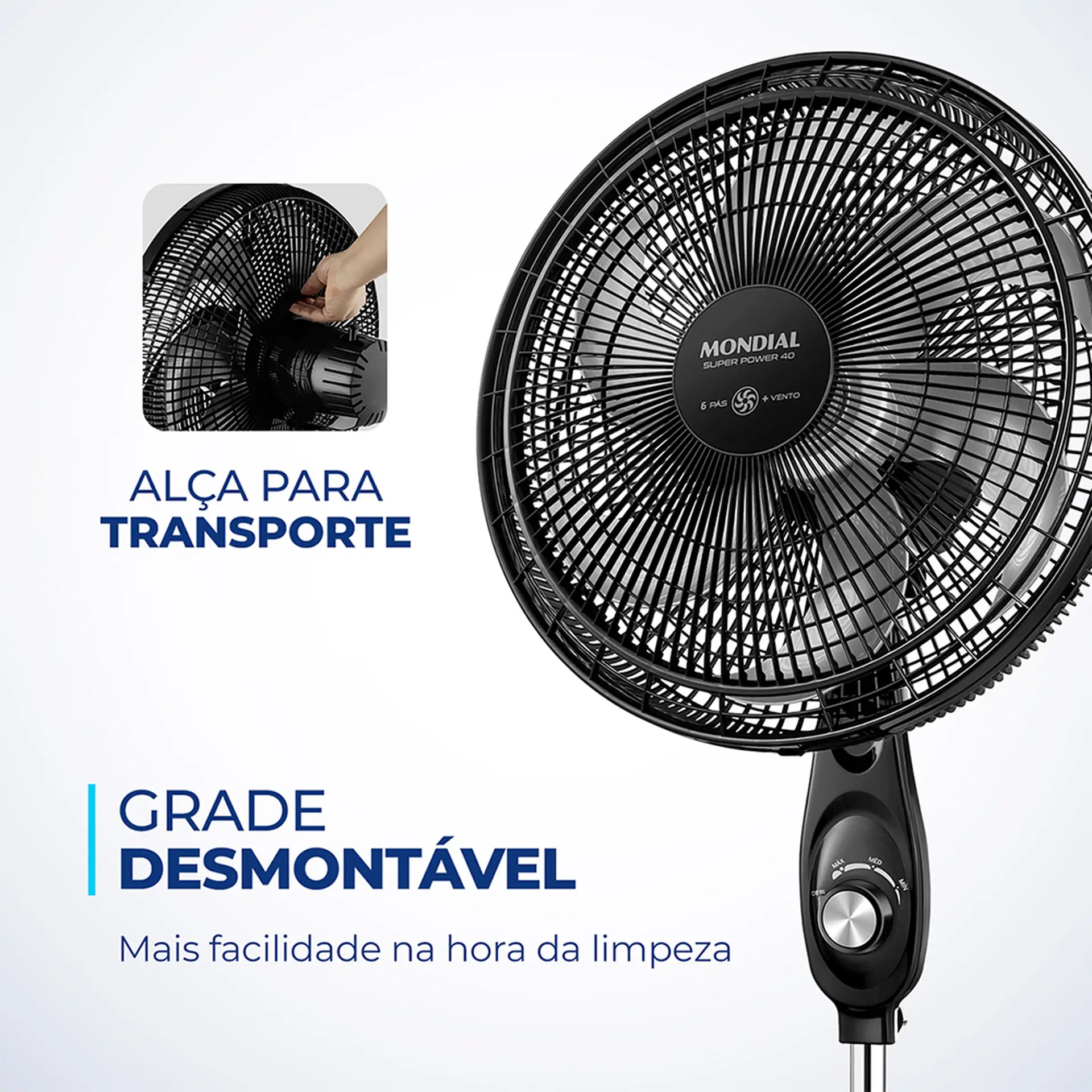 A linha de Ventiladores Super Power possui 40cm de diâmetro e 6 Pás. O design, aliado à potência, promove maior intensidade do vento e é garantia de um ambiente fresco e agradável.