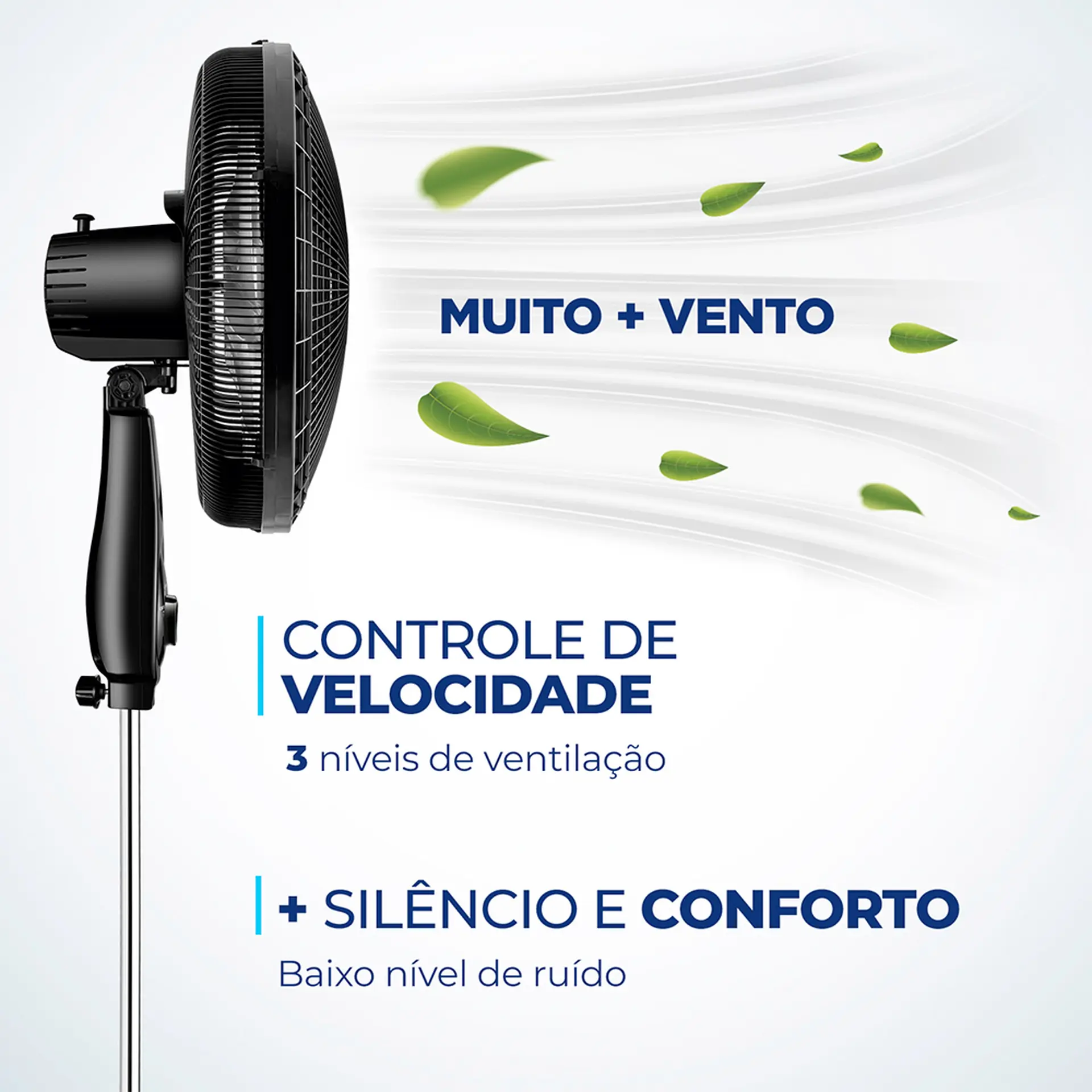 As 3 opções de velocidade permitem adequar o vento à sua necessidade: Máxima Turbo, Média Conforto e Mínima Silencioso.